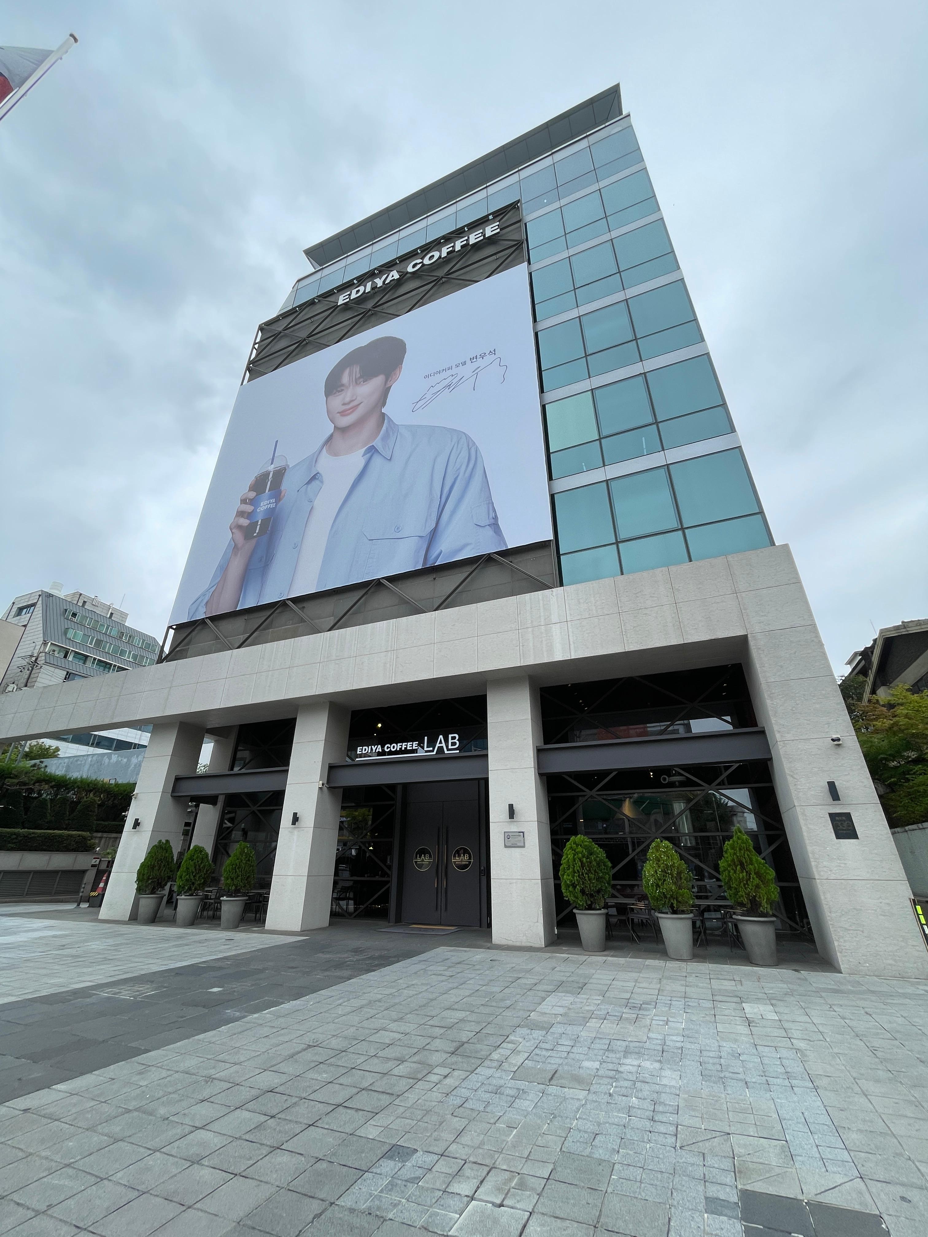 행사 당일, 이디야 본사에 도착했을 때 건물 앞에 걸려 있던 광고 모델 변우석의 대형 현수막이 반갑게 맞이해 주었다.
