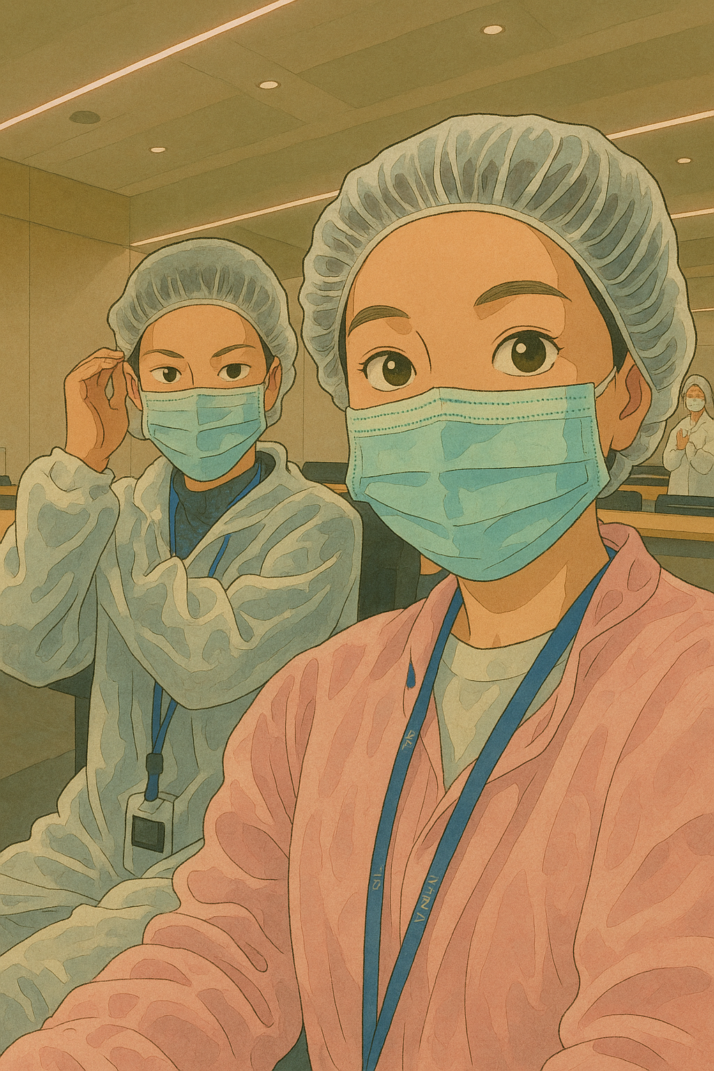 위생복과 모자, 덧신, 마스크를 착용하고,