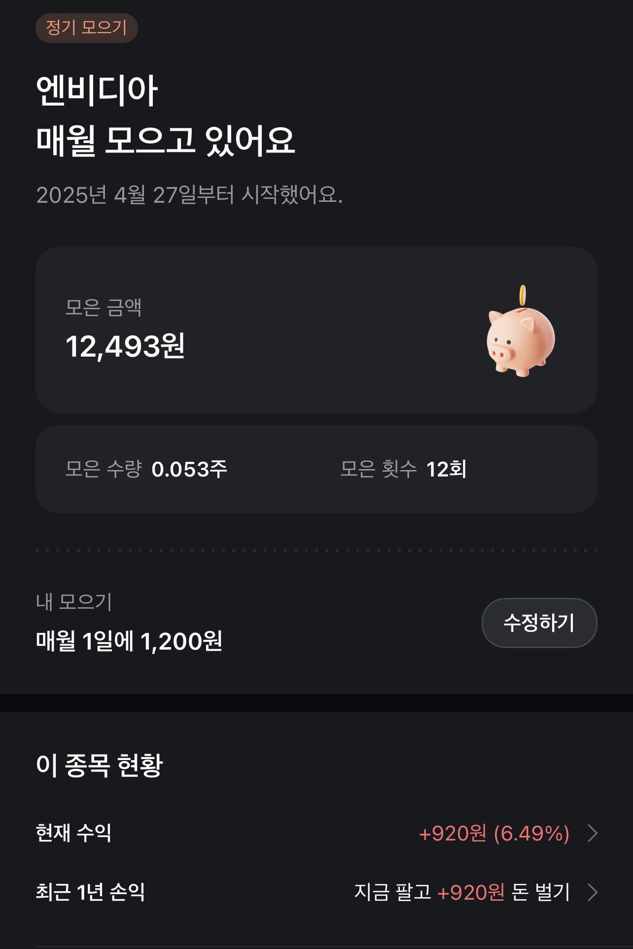 매달 1,200원을 자동으로 투자하도록 설정했고, 종목은 엔비디아 하나로 유지했다.